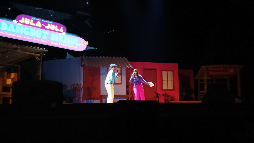Setelah sambutan disampaikan, MC membacakan tata tertib selama pertunjukan. Pengunjung dilarang menyalakan flash handphone (HP) saat mengambil foto dan video selama pertunjukan drama berlangsung. Kemudian, MC membacakan sinopsis cerita “Jula-Juli Dangdut Menul” yang diadaptasi dari lakon Jeng Menul karya Puthut Buchori. Pertunjukan drama dimulai pada pukul 18.16 WIB dengan nyanyian. Pengunjung diarahkan untuk duduk pada kursi bagian tengah yang terbagi menjadi kelompok hak e hak e (regular), hokya-hokye (VIP), dan sak jos e (VVIP).