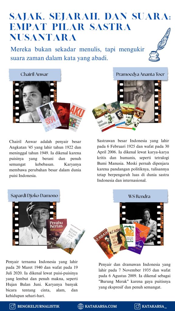 Empat Tokoh, Satu Nafas Sastra IndonesiaSastra bukan hanya soal menulis indah, tapi juga tentang bagaimana kata-kata merekam denyut zaman dan suara masyarakat. Lewat infografis ini,..