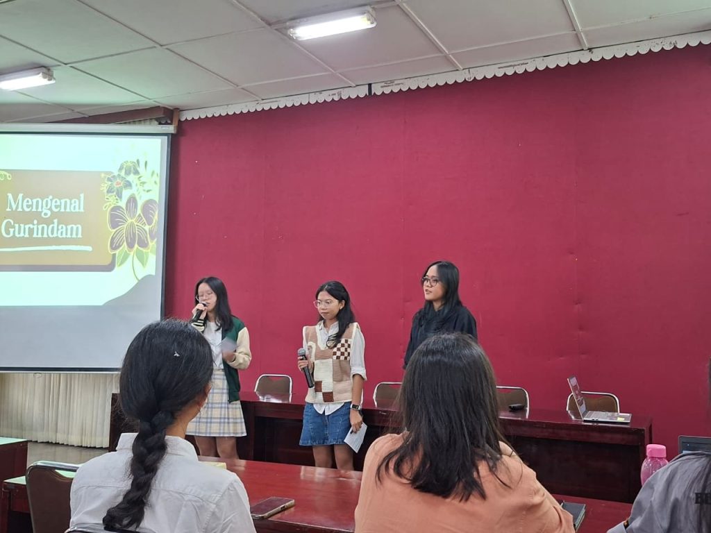 Presentasi pengenalan gurindam dipaparkan oleh tiga mahasiswa Sastra Indonesia Universitas Sanata Dharma, yaitu Salma, Bene, dan Lin Lin. Presentasi serupa juga dilakukan tahun lalu dengan tema pantun.